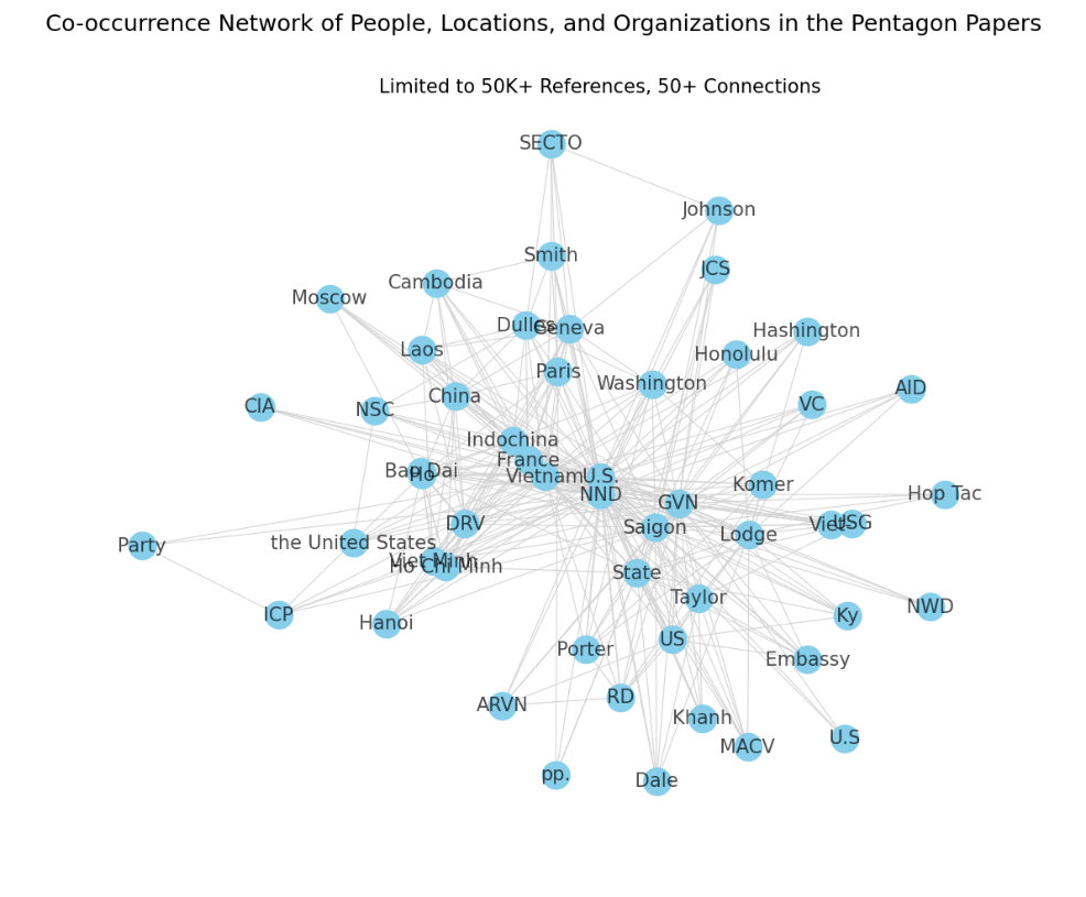 The graph shows some powerful relationships. I had to limit it to entitles with 15K references, and connections stronger than 50. At this level, it’s probably only useful for those of us who don’t know much about the war, because most are obvious connections (“Washington” with “United States” and “U.S.”, or “Cambodia” with “Laos’).