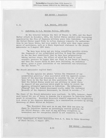 TOP SECRET -Sensitive I. A. U.S. POLICY, 1940-1950 1. Indochina in U.S. Wartime Policy, 1941-1945 In the interval between the fall of France in 1940, and the Pearl Harbor attack in December, 1941, the United States watched with increasing apprehension the flux of Japanese military power into Indochina. At first the United States urged Vichy to refuse Japanese requests for authoriza-tion to use bases there, but was unable to offer more than vague assur-ances of assistance, such as a State Department statement to the French Ambassador on 6 August 1940 that: “We have been. doing and are doing everything possible ’l-Tithin the framework of our established policies to keep the situation in the Far East stabilized; that we have been progressively t…